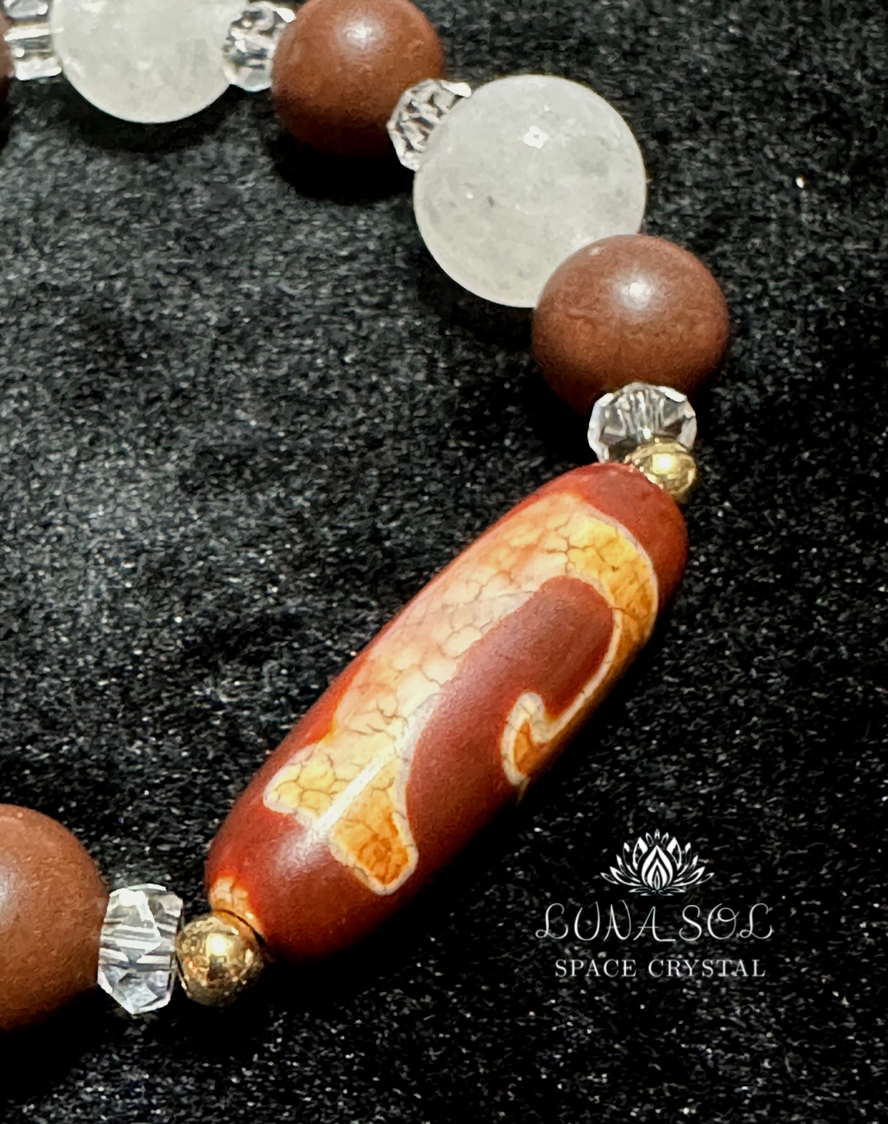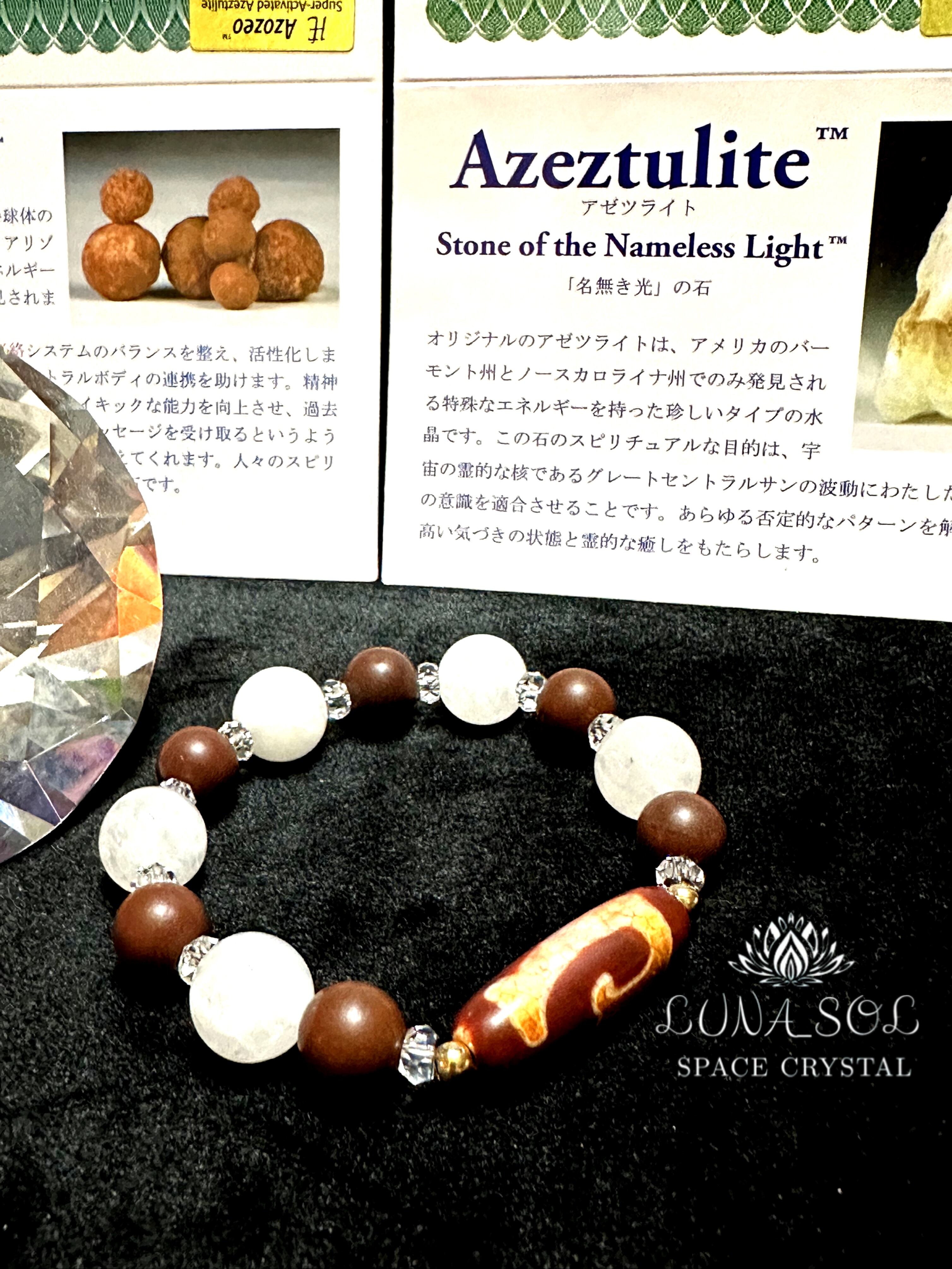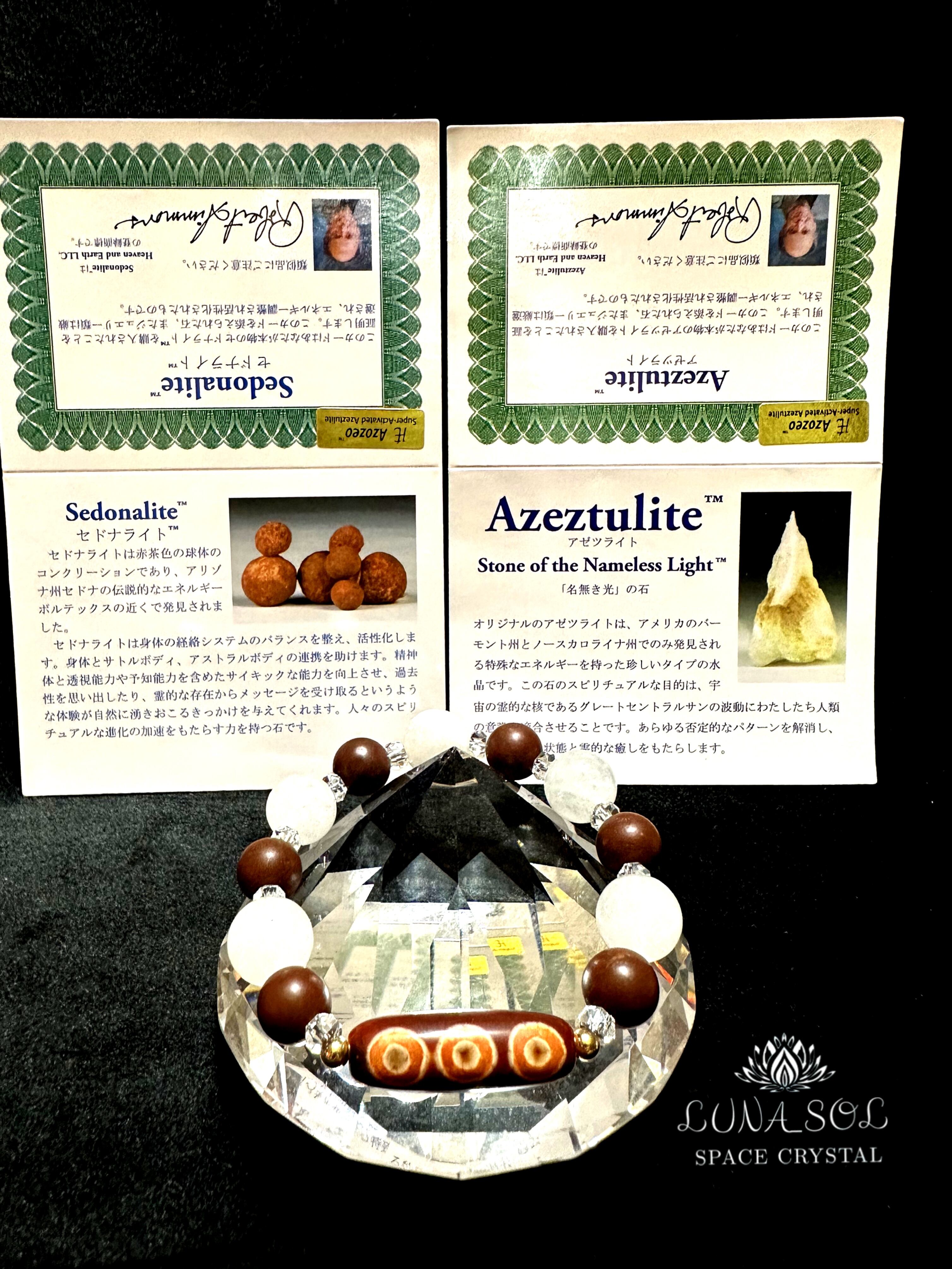 龍紋緑度母天珠に高波動を持つアゼツライトと聖地セドナの磁場エネルギーを秘めたセドナライトとのサイキックブレスレットに組み合わせしました。