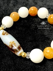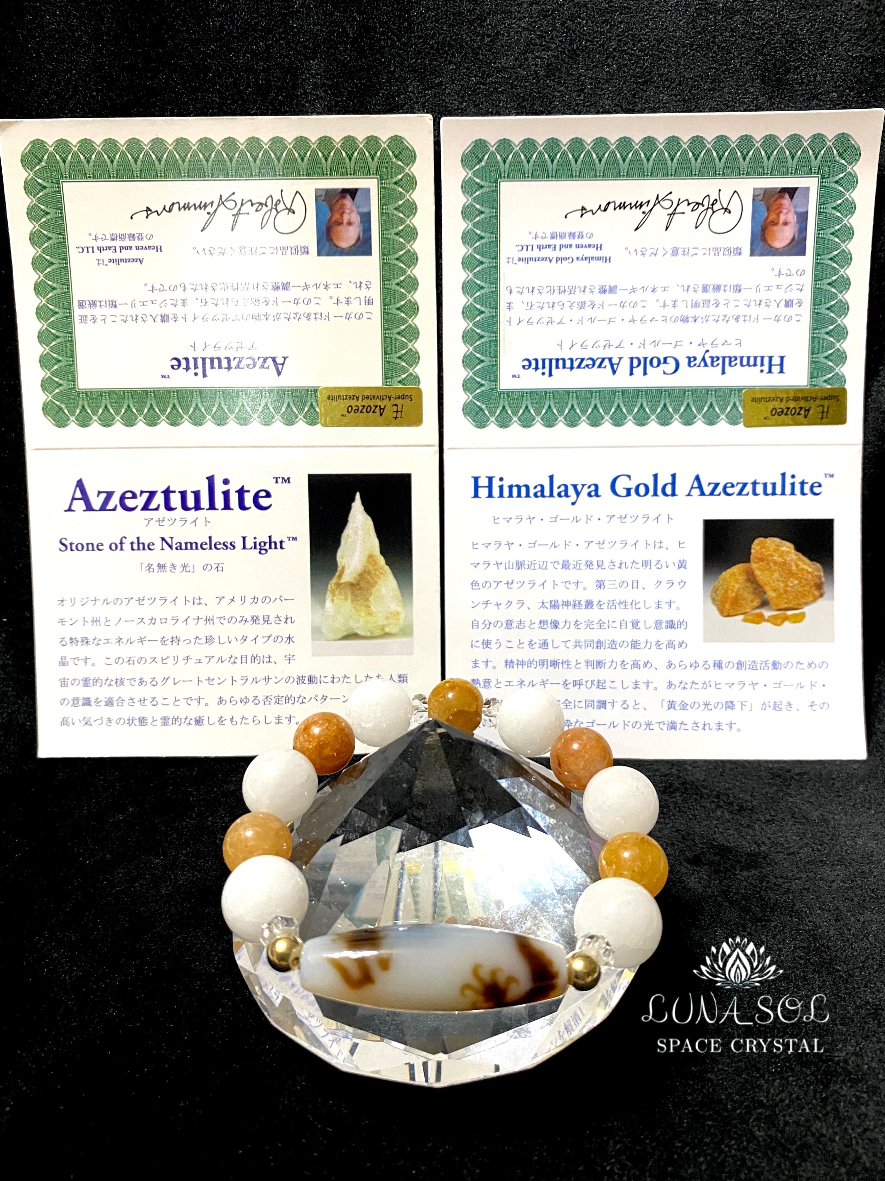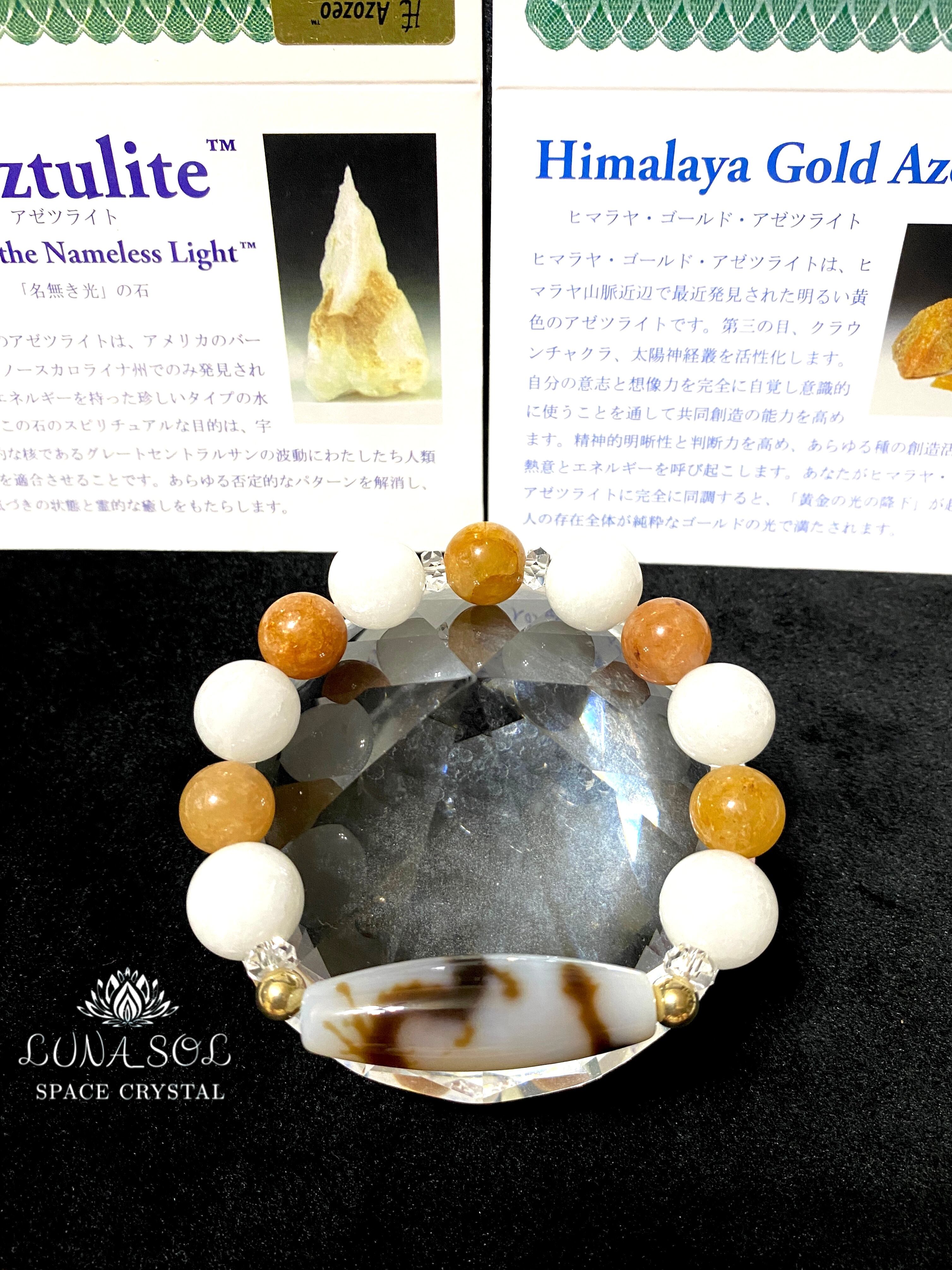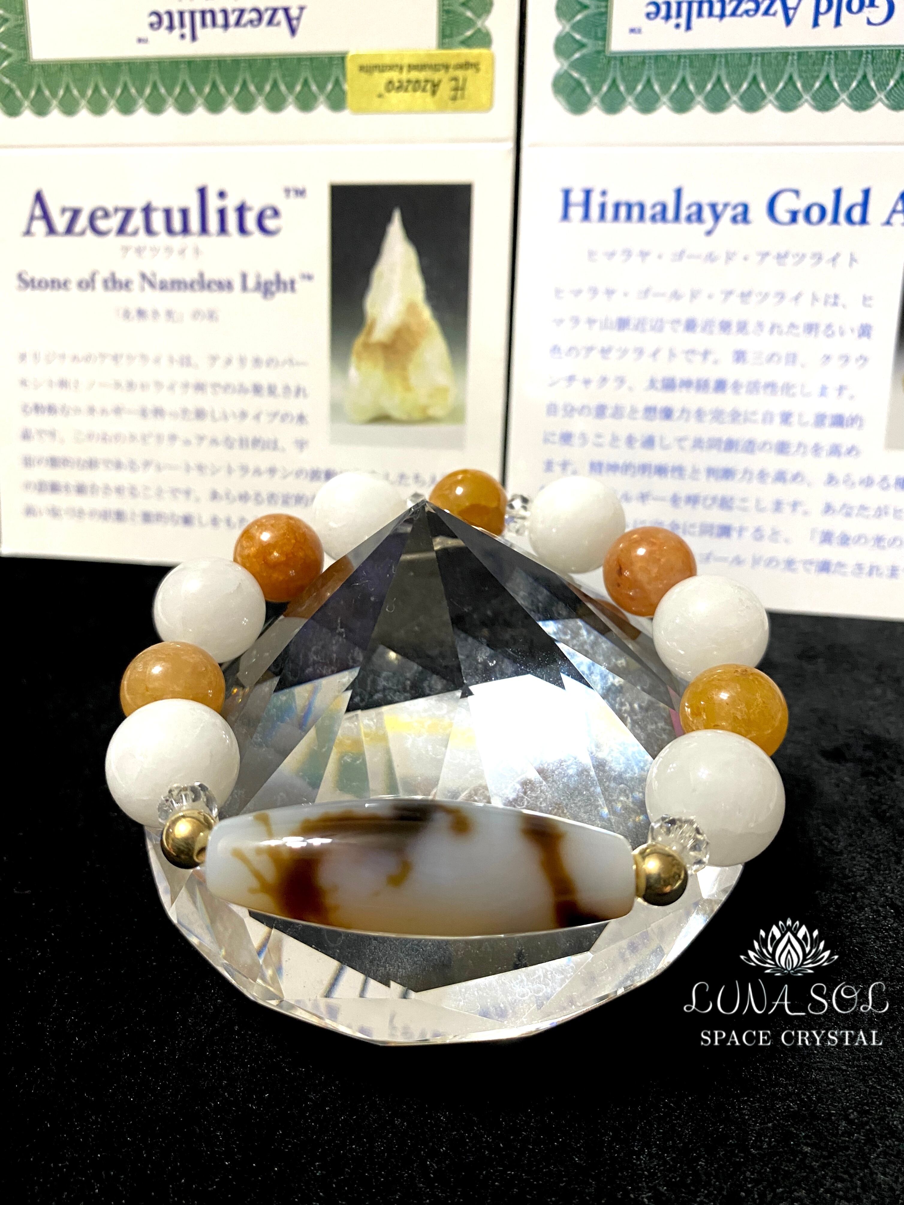 天珠は、品質高い白瑪瑙に五本爪を持つ上り龍が綺麗に焼かれた最高天珠です。天珠にゴールドカラーのエナジーが強い高波動のヒマラヤゴールドアゼツライト、アゼツライトを合わせ、龍神力引き出すエナジーで組合わせて頂きました。エネルギー入れた龍神存在に意識を高めていくと繋がりの体感が強くなります。