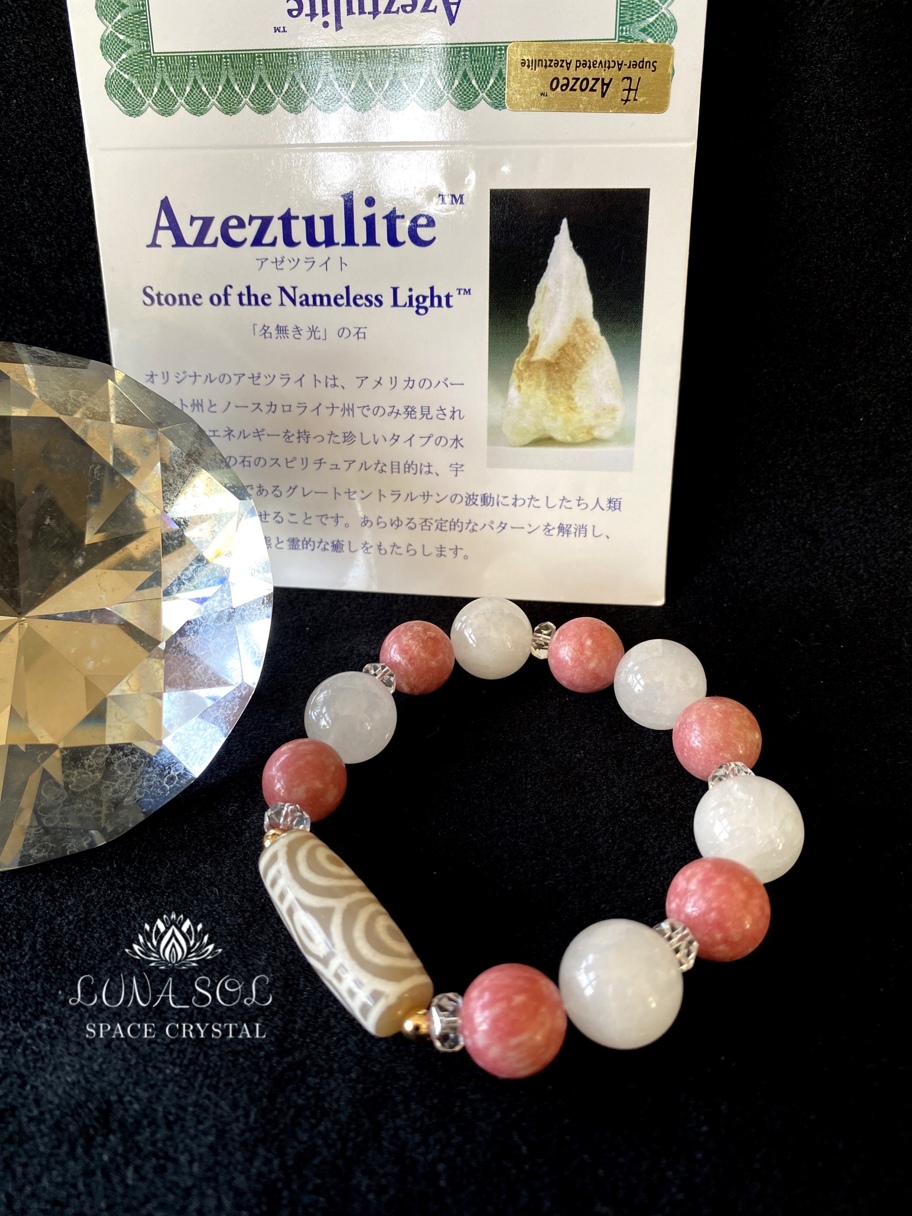 龍眼天珠に、高波動のアゼツライトと柔らかなピンクロードナイトに組み合わせにしました。