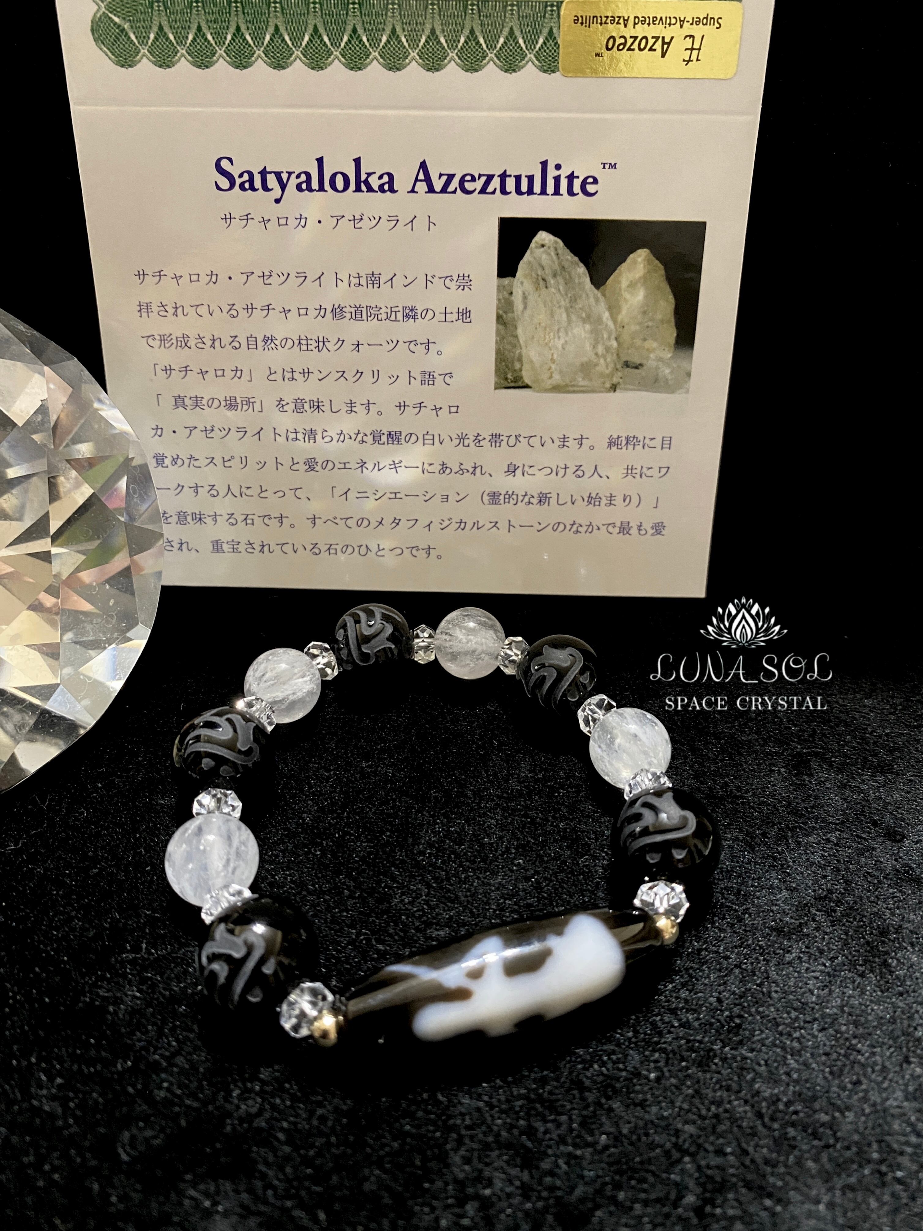 琵琶観音天珠合う、存在感ある守護キリーク梵字が彫られた高品質の大玉オニキスとエナジーが強い高波動のサチャロカアゼツライトと組み合わせにしました。