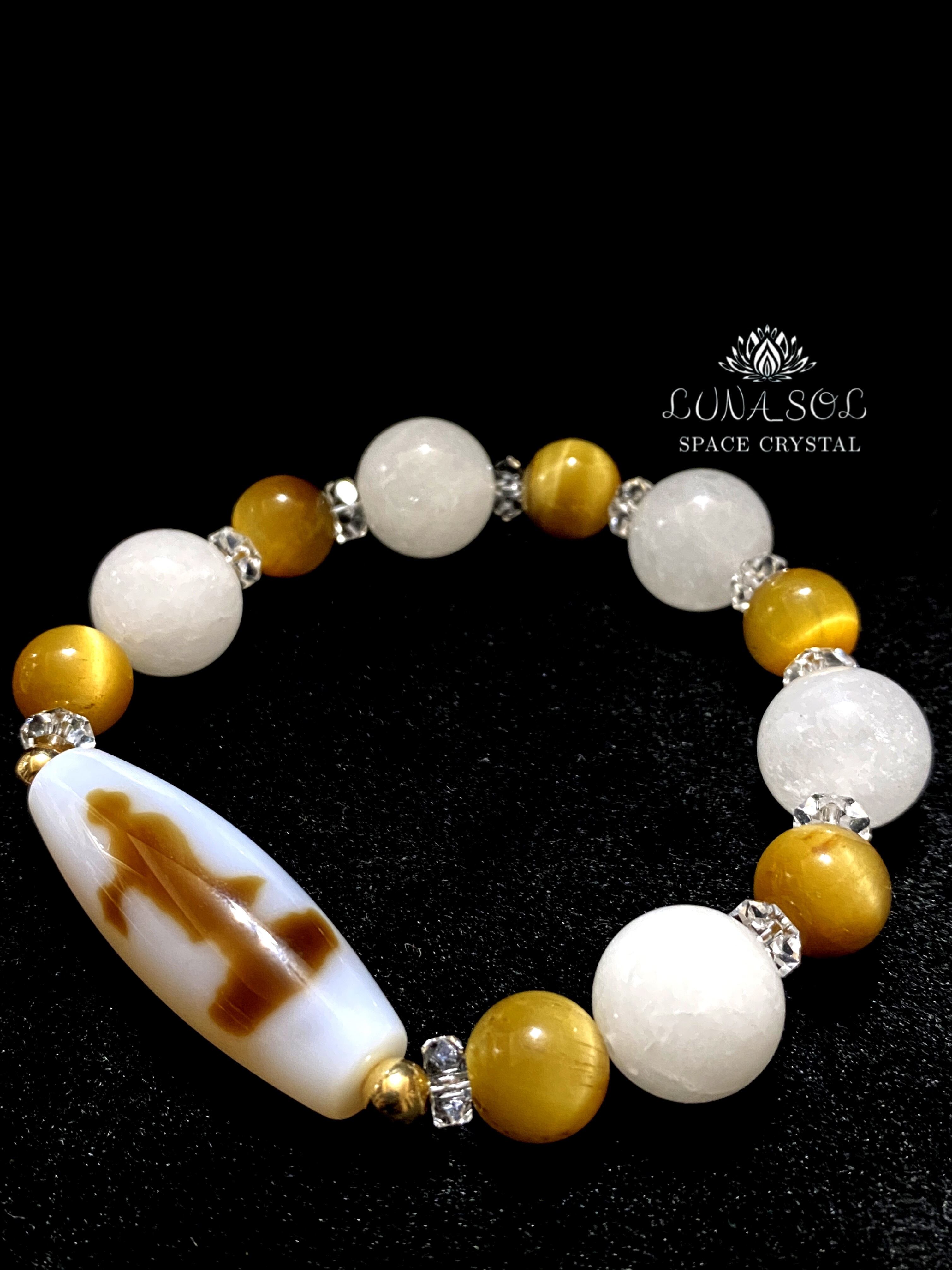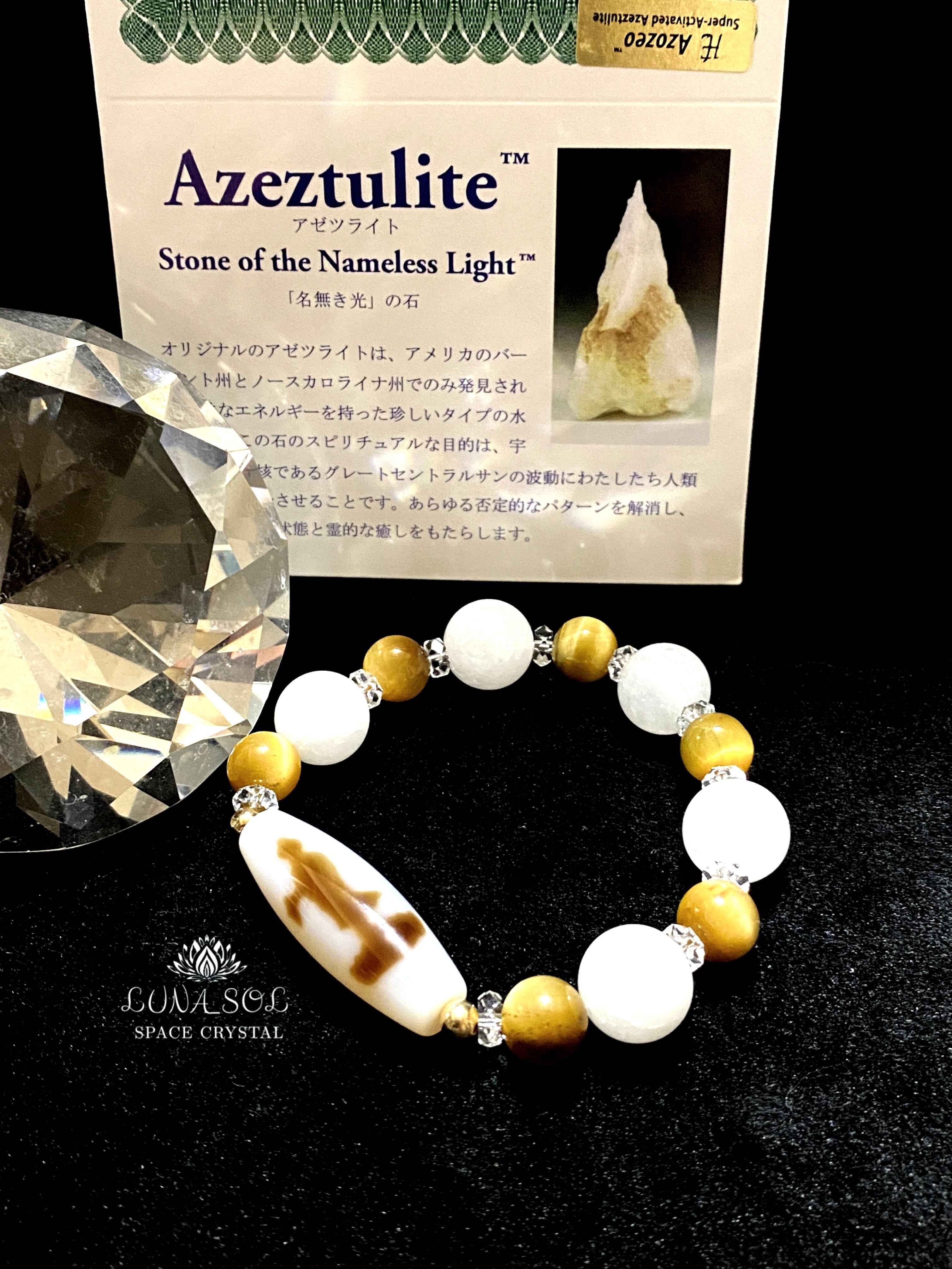 白如意観音天珠に、高波動のアゼツライトと輝き強いゴールデンタイガーアイと組み合わせました。