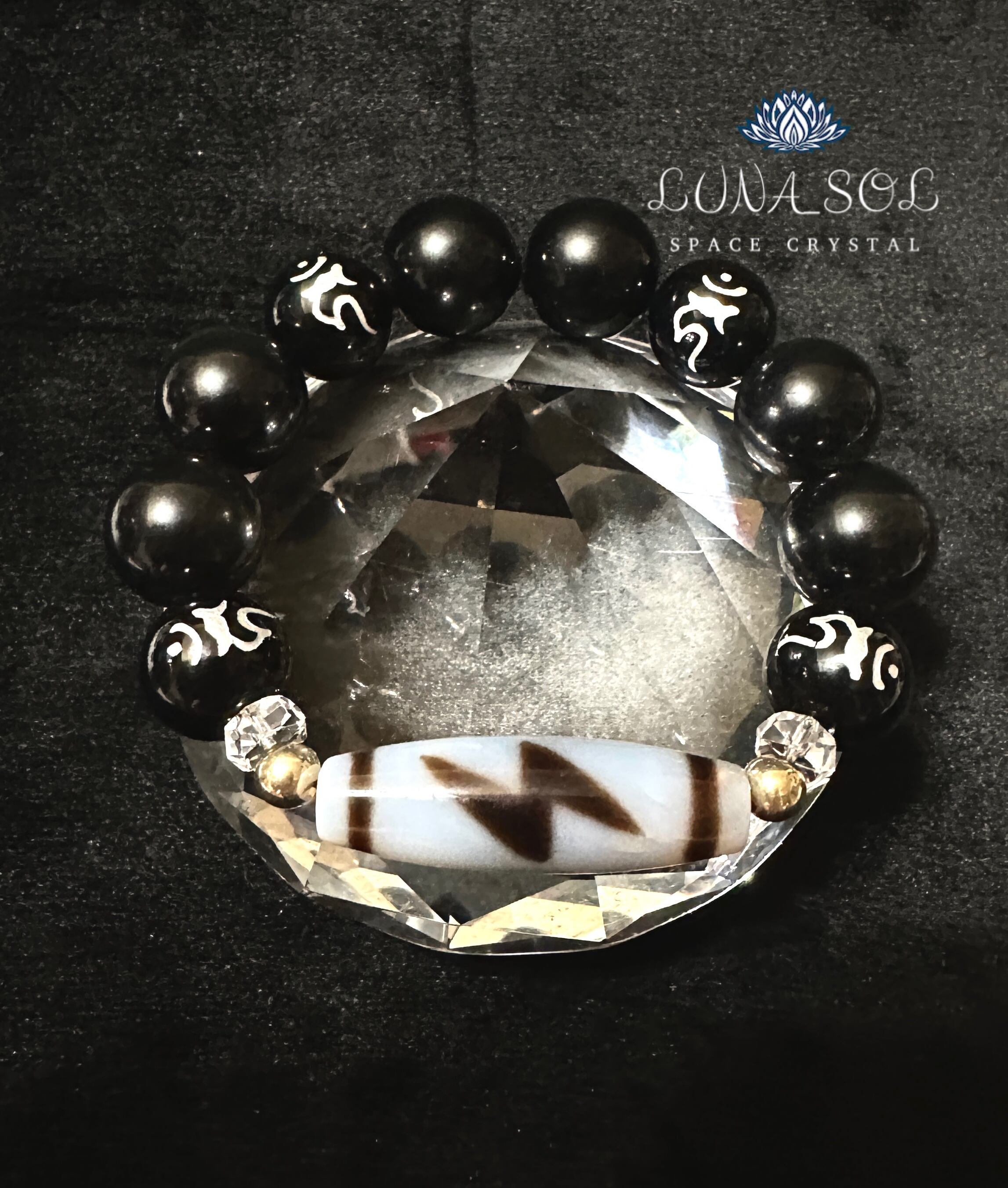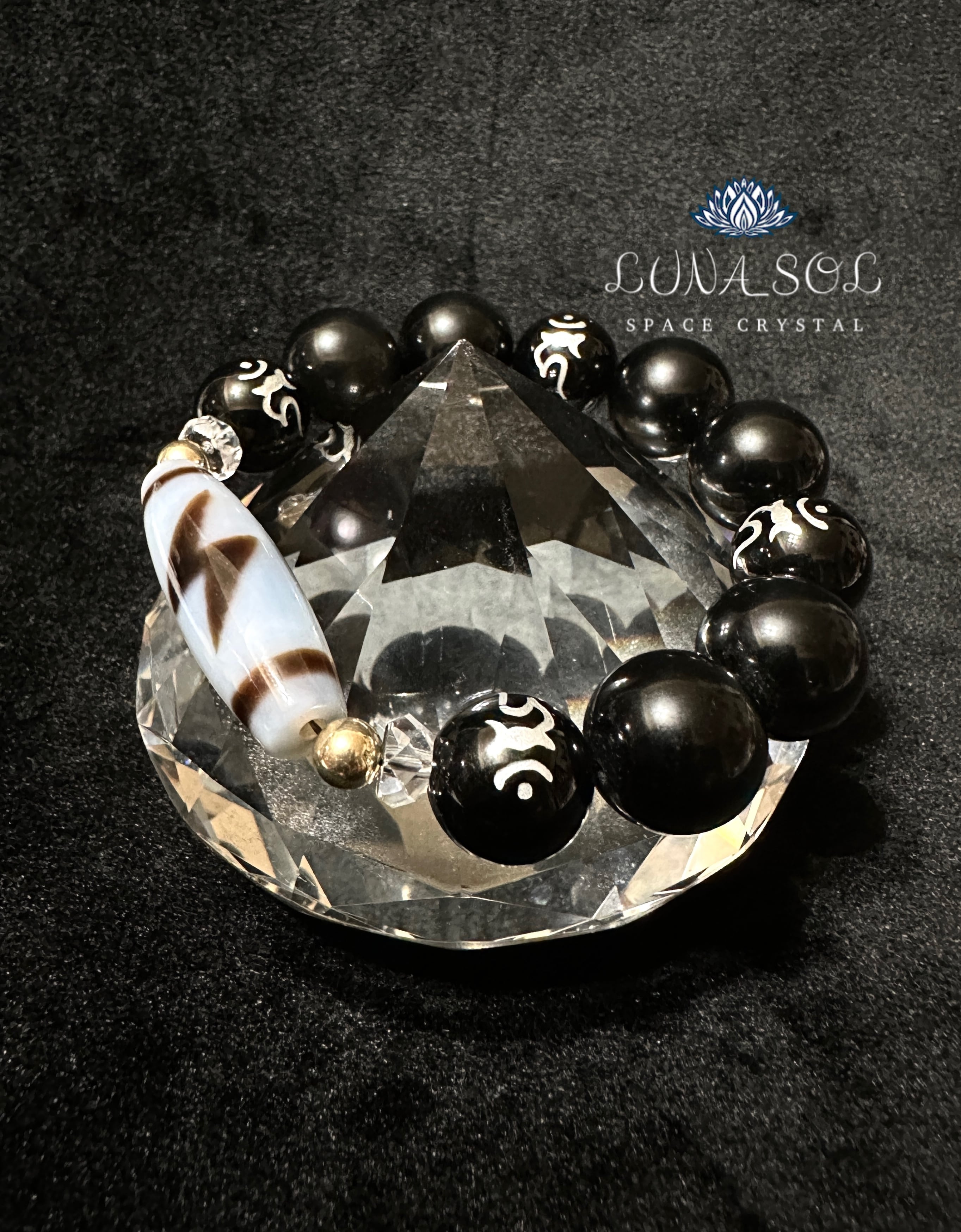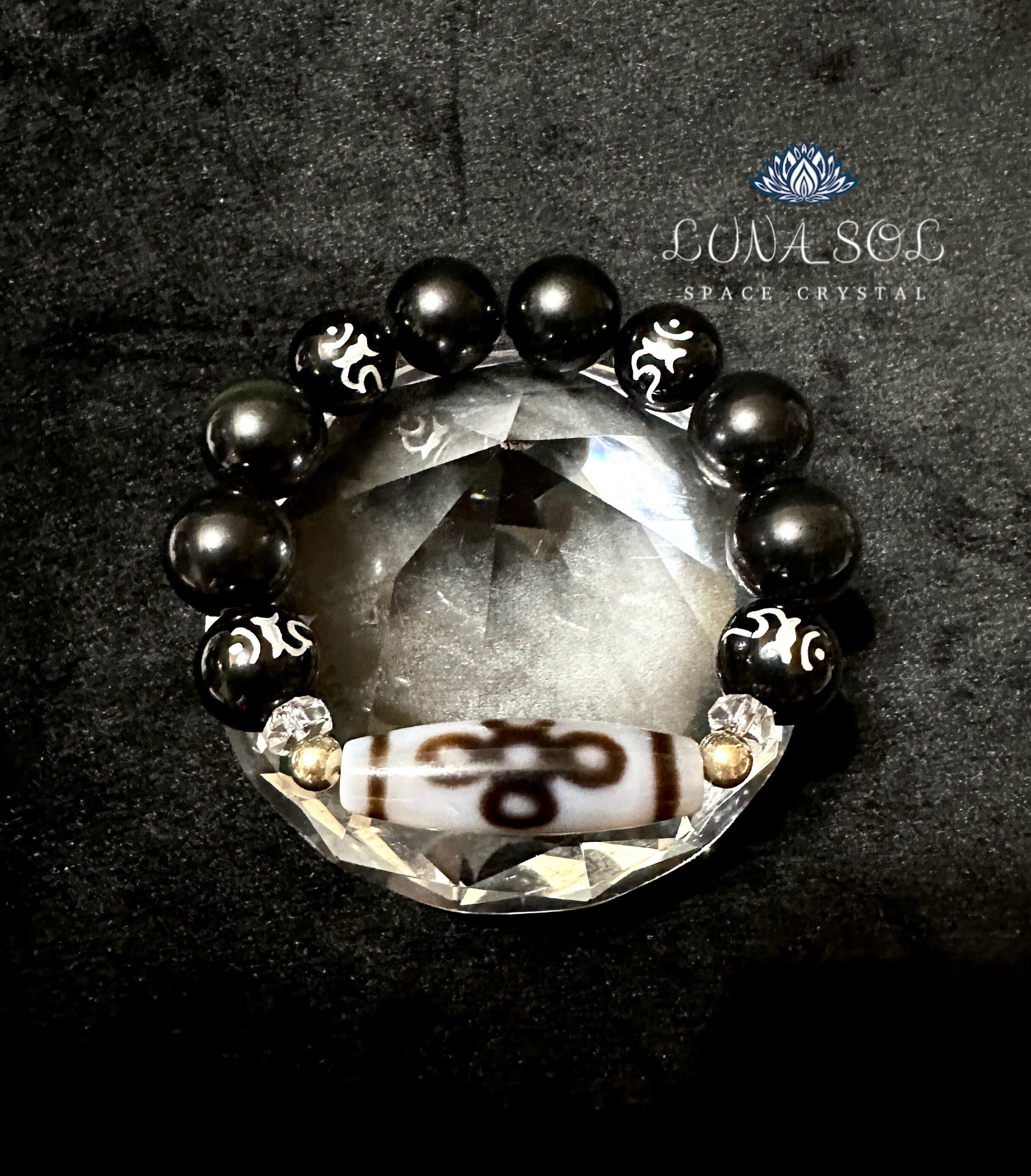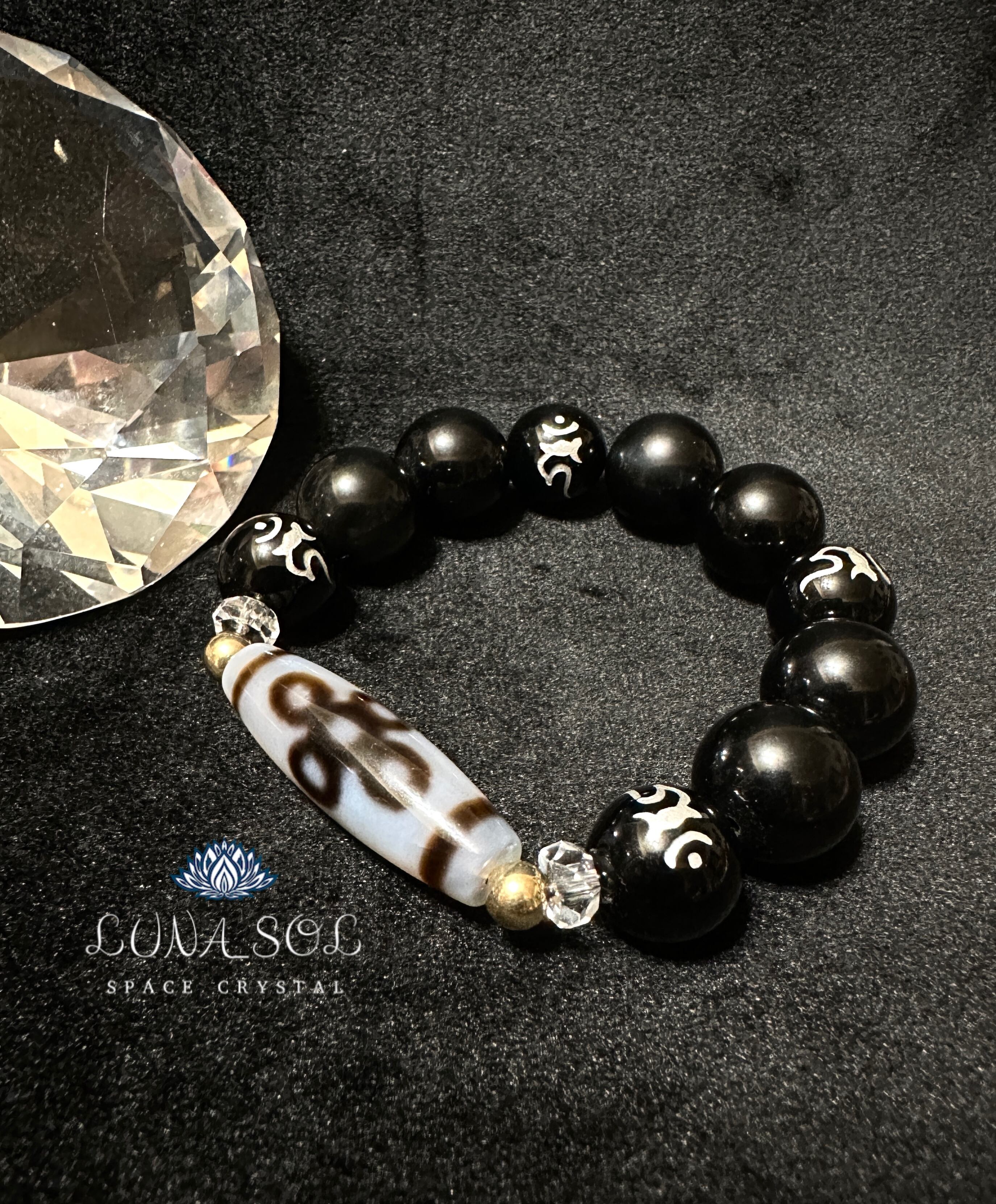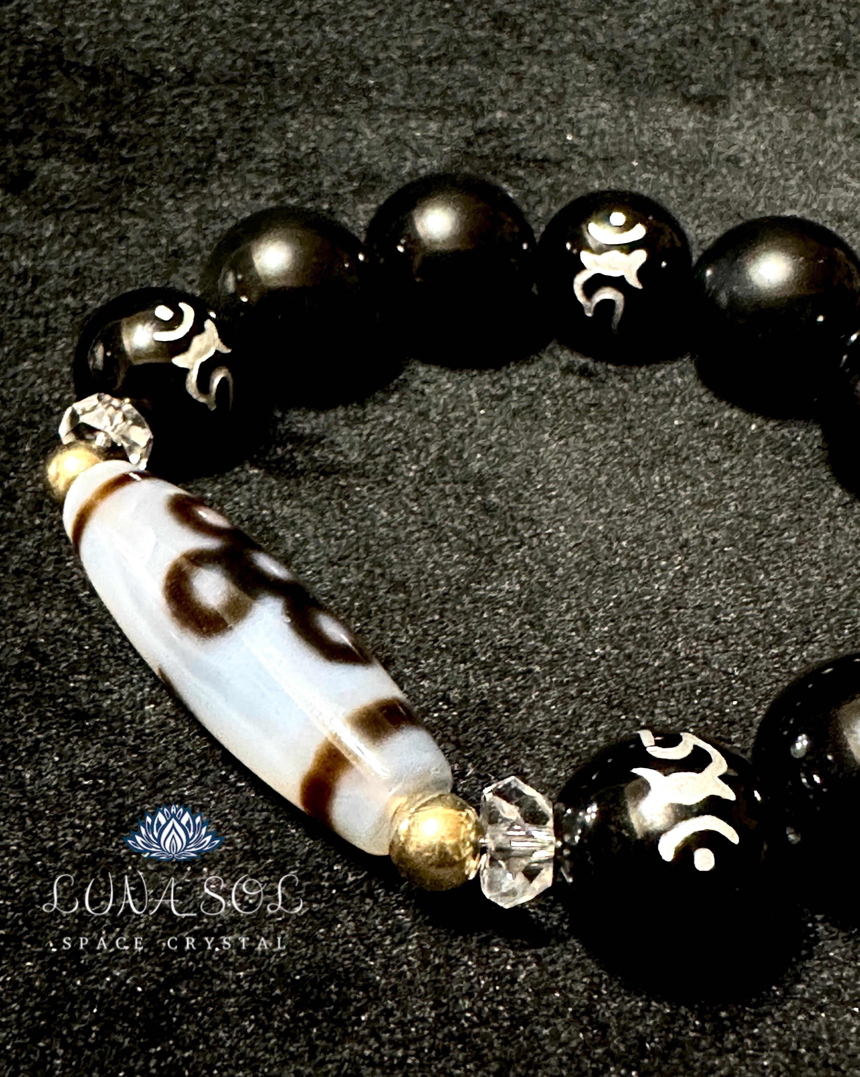 透明度ある白瑪瑙の閃電五眼天珠に不動明王の梵字(カーン)が彫られたオニキスにシラー入りの大玉オブシディアンと合わせました。不動明王の意識と合わさる事で何事にもブレず動じない守護エネルギーが備えられます。高次能力開花、全ての邪気避け、開運エネルギー高めるブレスレットに組み合わせしました。