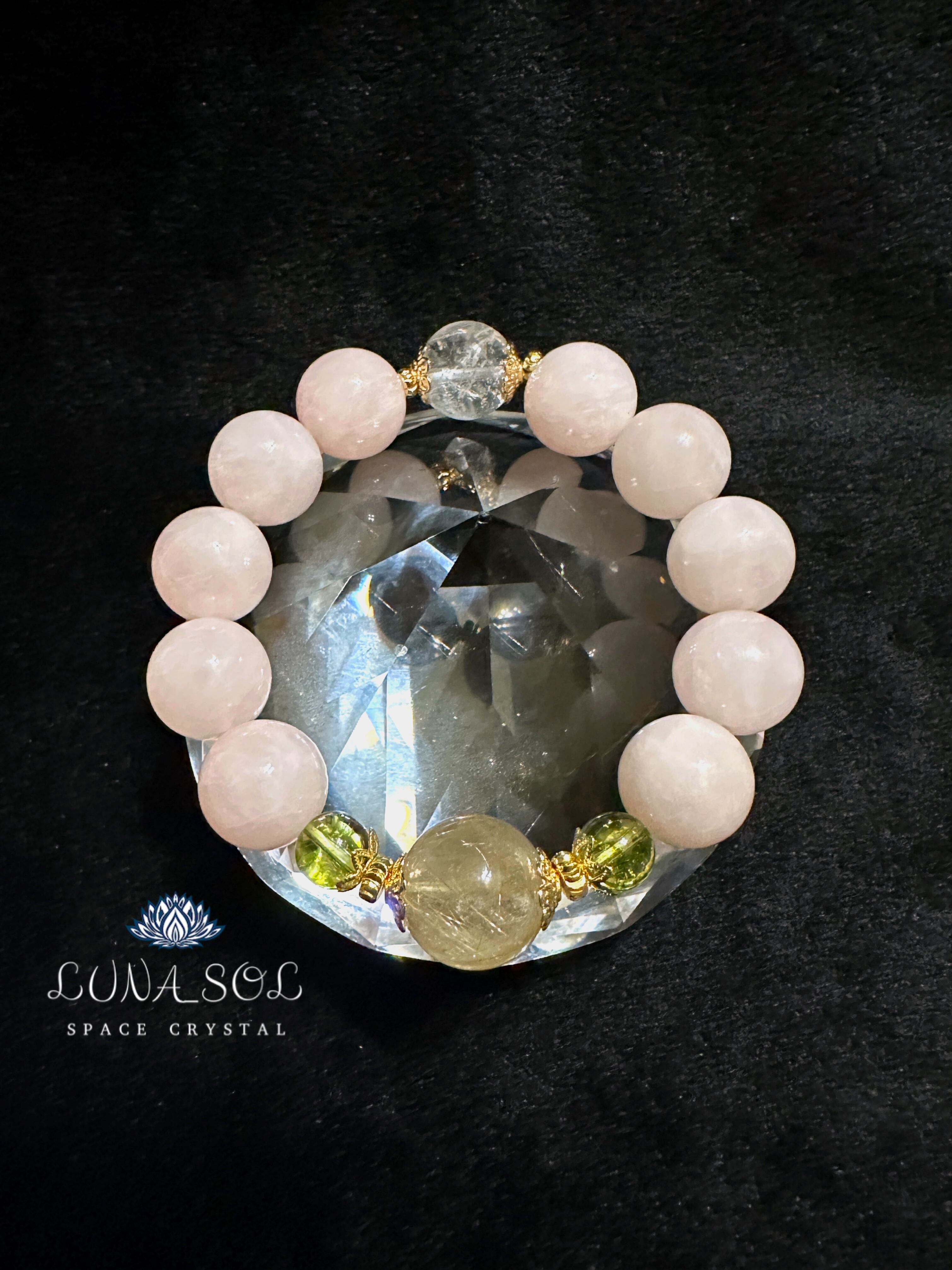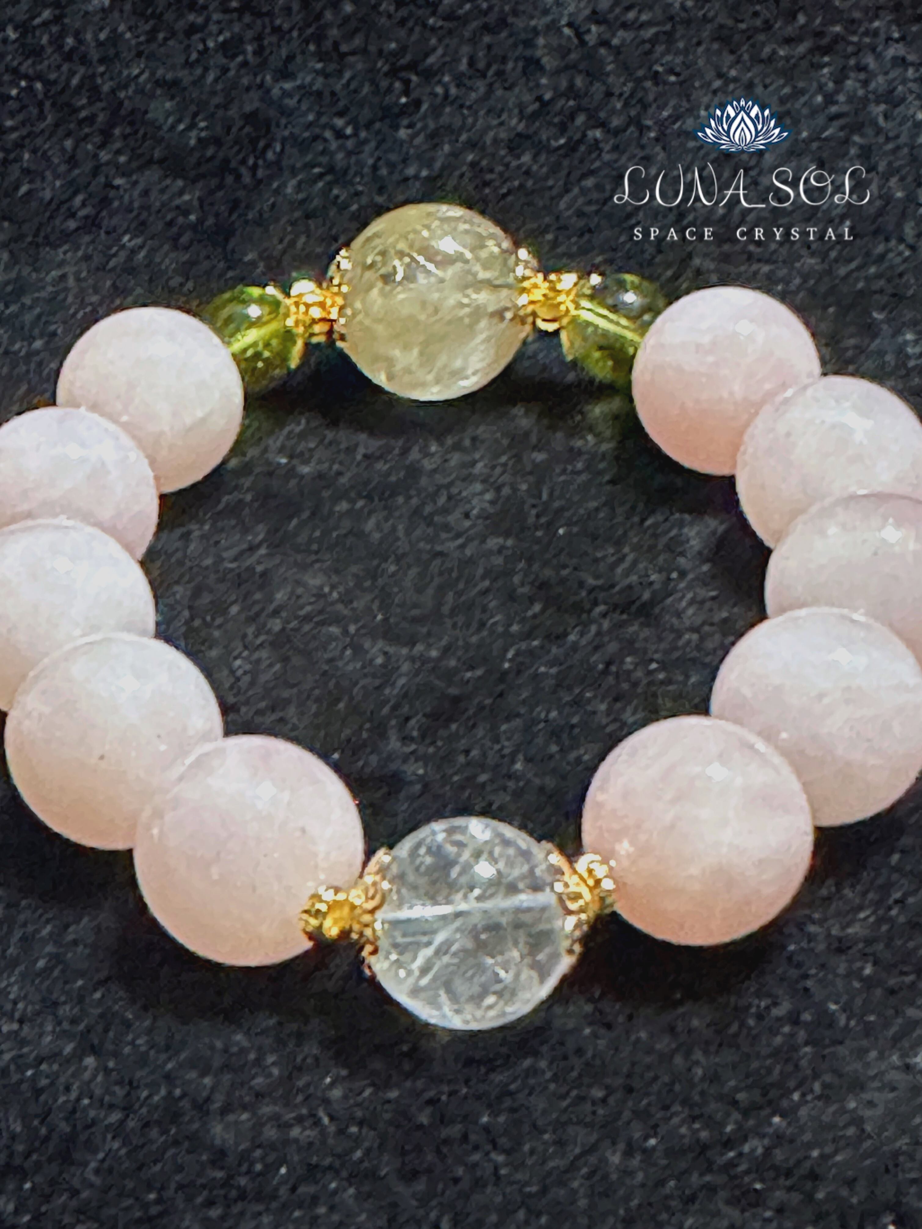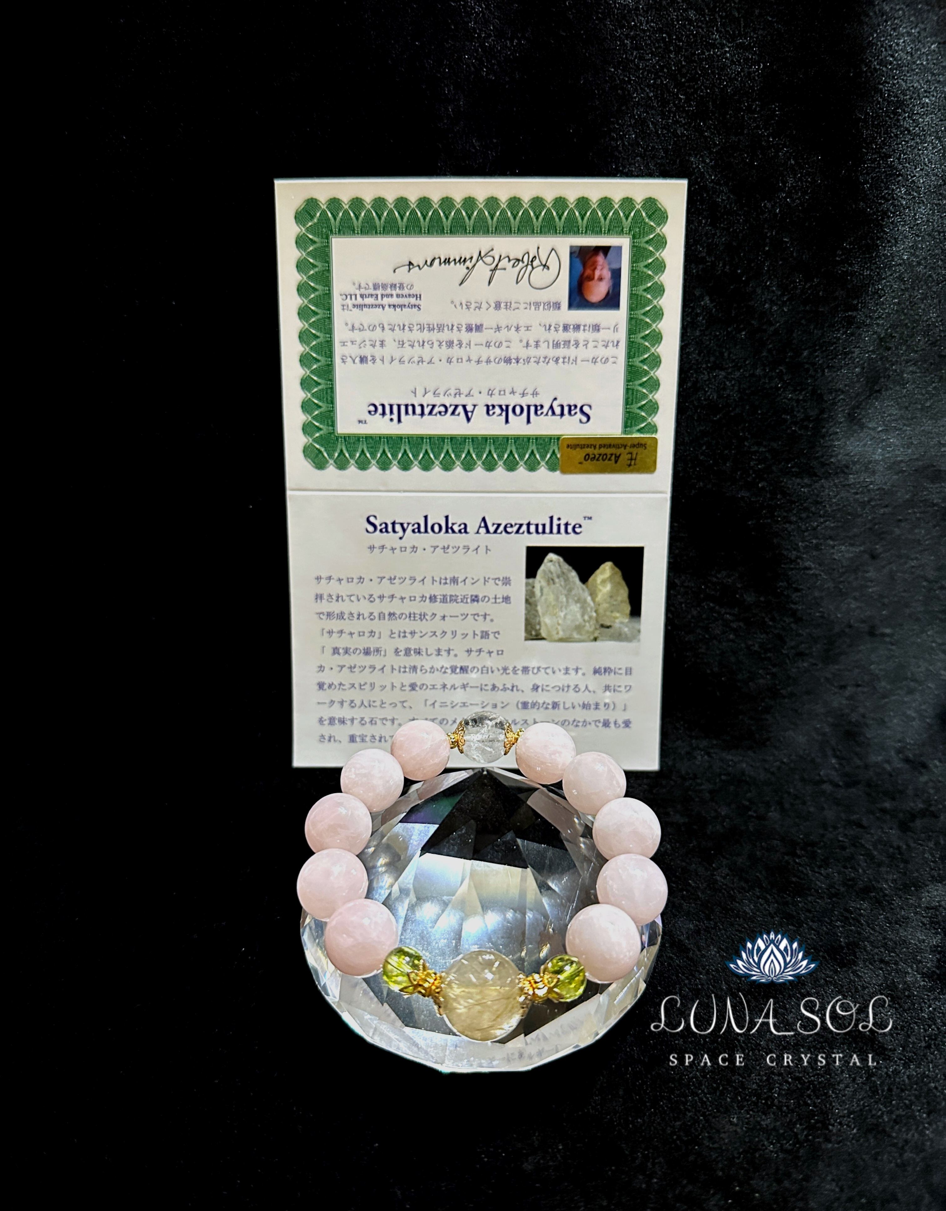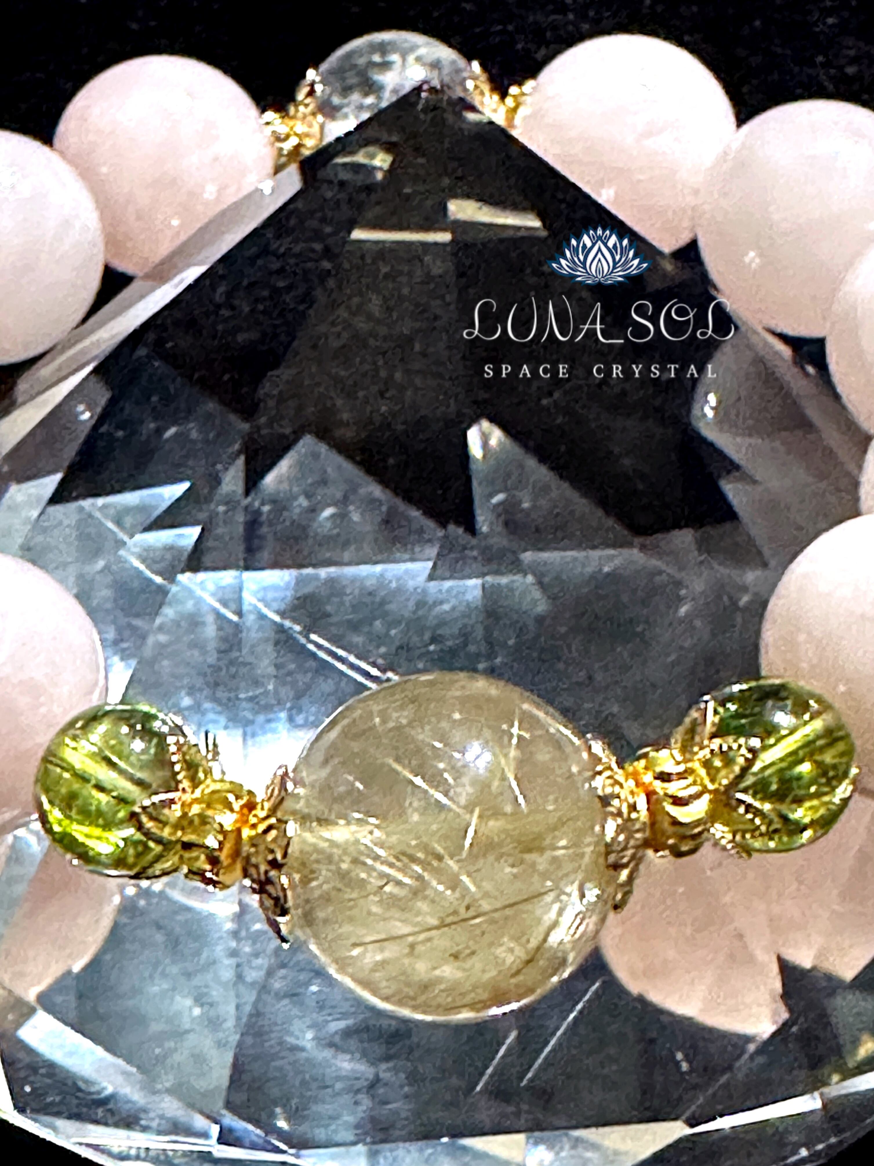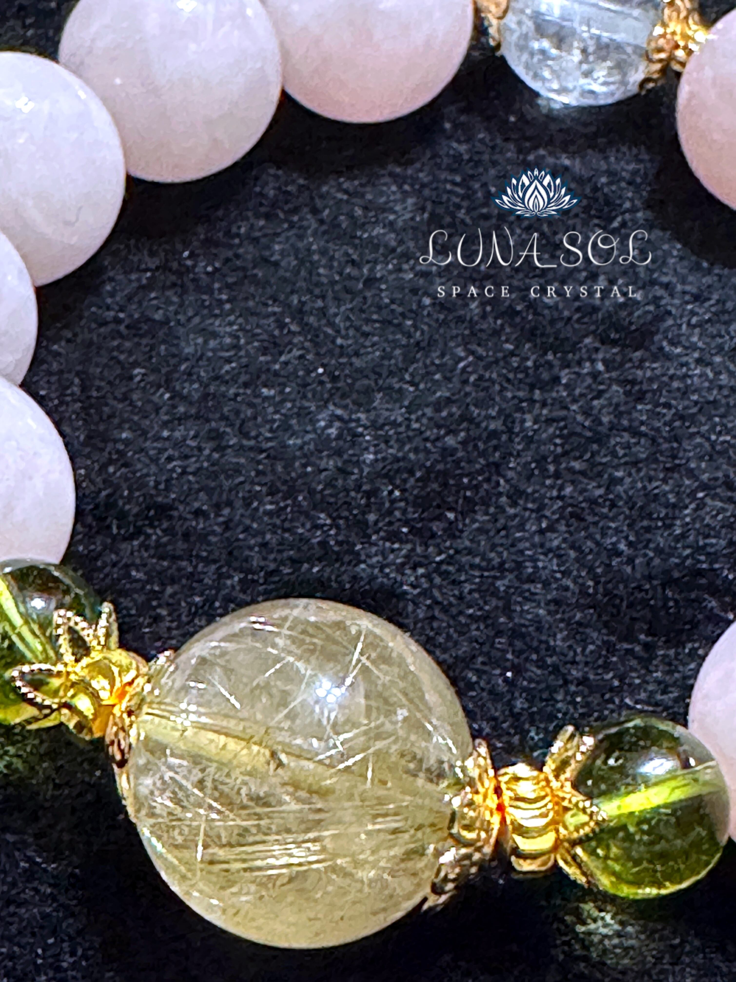 高品質の金針入りルチルクォーツに高波動のサチャロカアゼツライトと人気力高めるモルガナイト、ペリドットと組み合わせました。