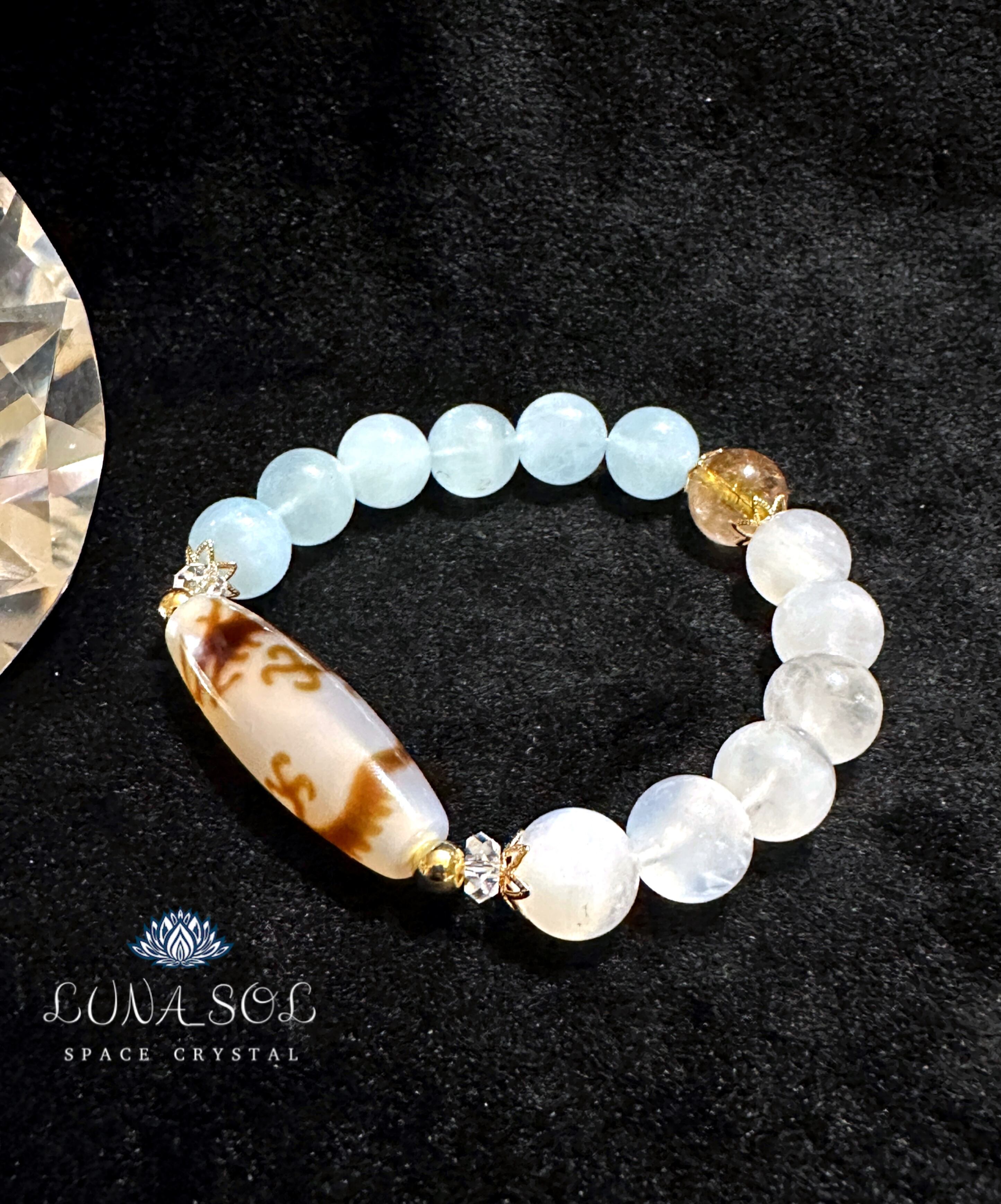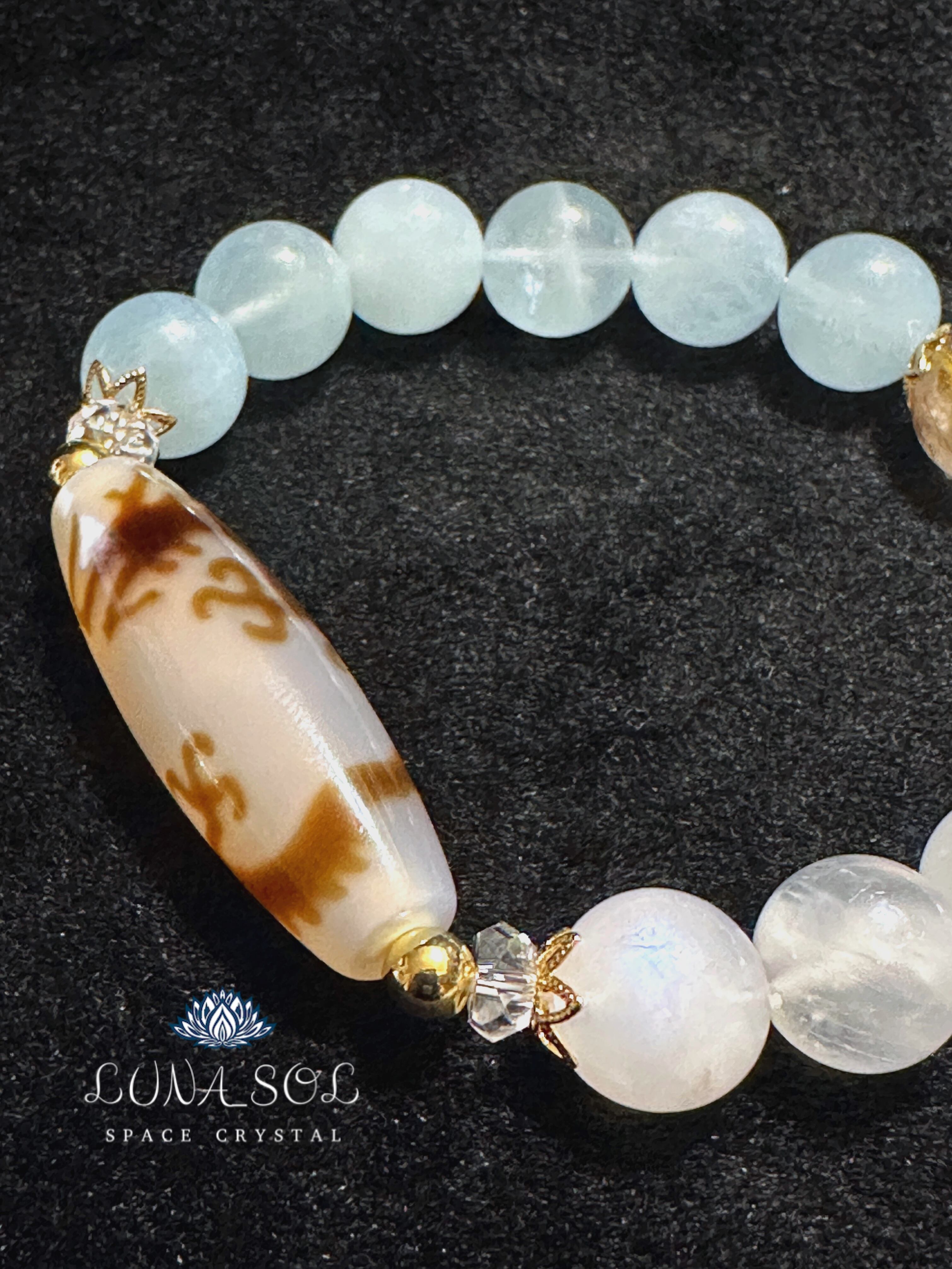 三本爪龍神天珠に、平和、調和、癒しの女神的エネルギーを放つムーンストーンとアクアマリンを組み合わせました。霊性高き願望実現を引き寄せます。